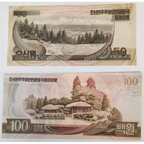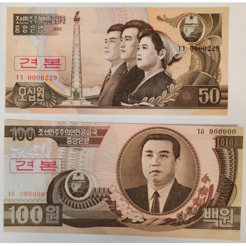 North Korea 1992 One 1 - One Hundred 100 Won Banknotes. Specimen