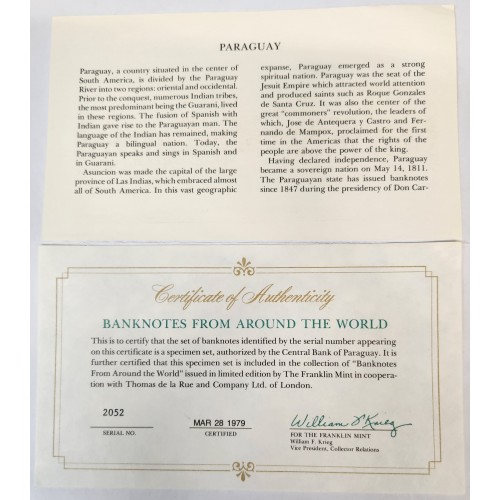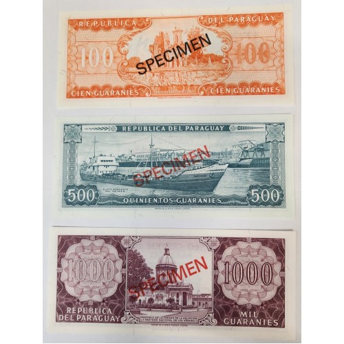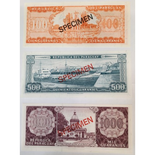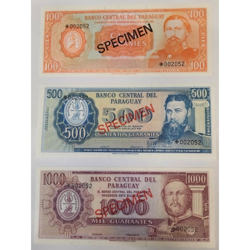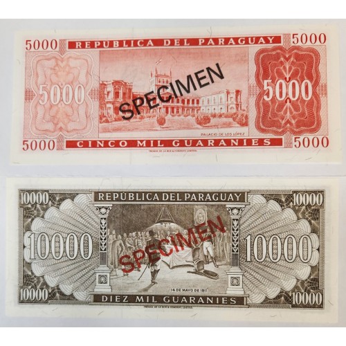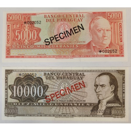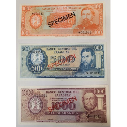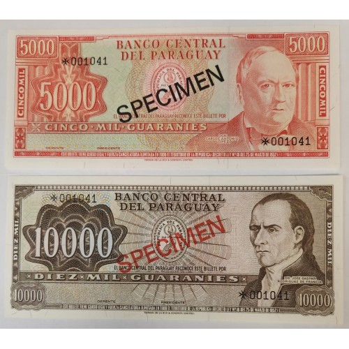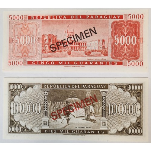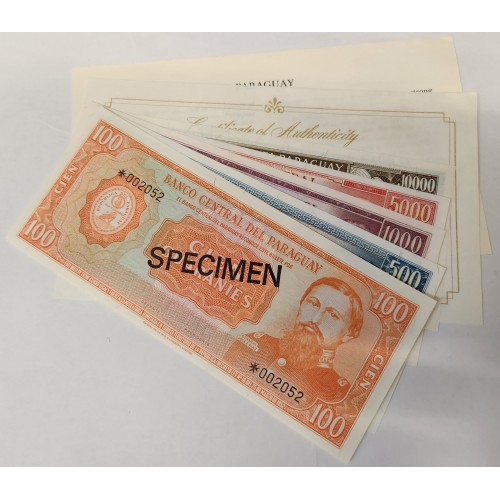 PARAGUAY 1979 . ONE HUNDRED 100 - TEN THOUSAND 10,000 GUARANIES BANKNOTES . SPECIMEN
