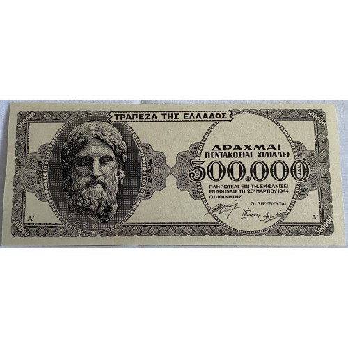 Greece 1944 Five Hundred Thousand 500,000 Drachmai Banknote. Specimen.