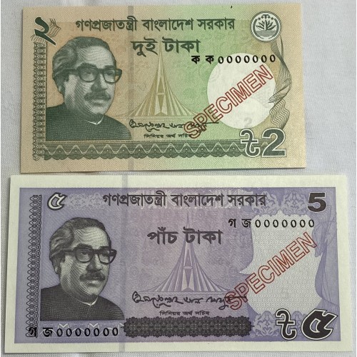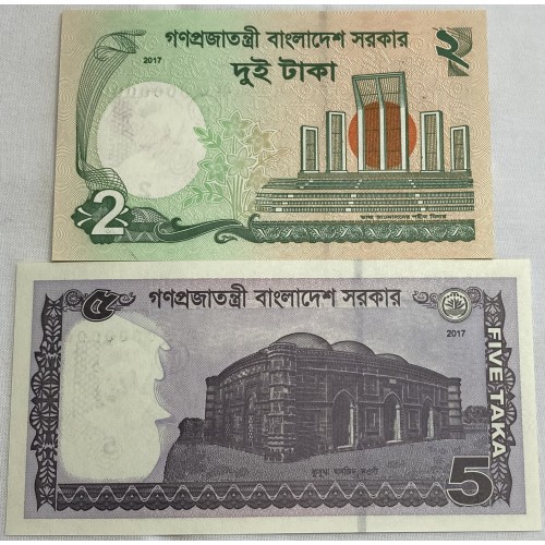 Bangladesh 2017 Two 2 and Five 5 Taka Banknotes. Serial: 0000000. Specimen.