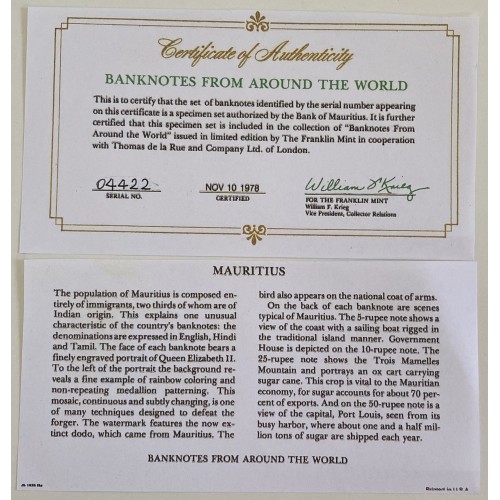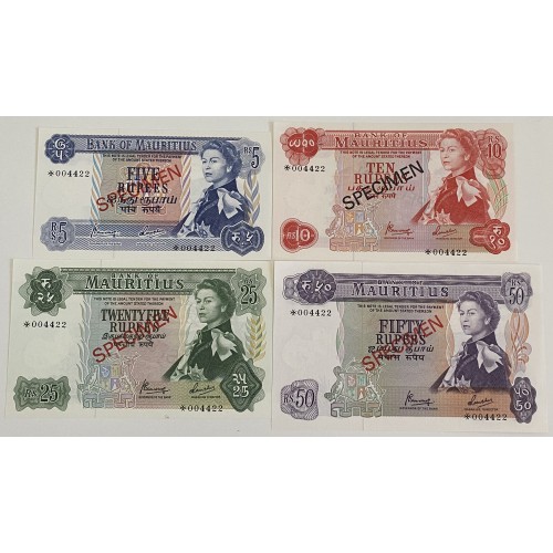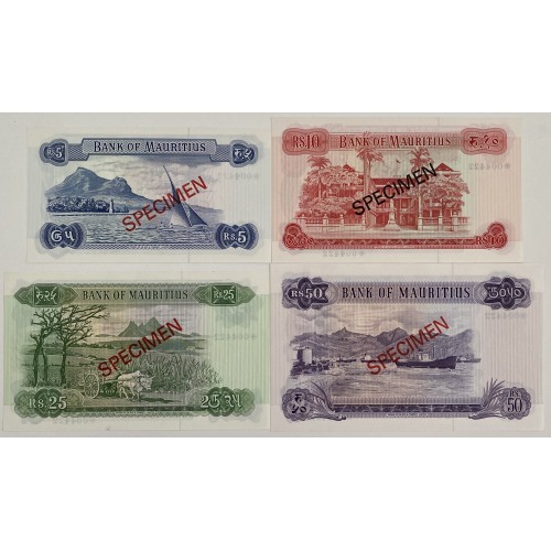 Mauritius 1978 Five 5, Ten 10, Twenty-Five 25, Fifty 50 Rupees Banknotes.