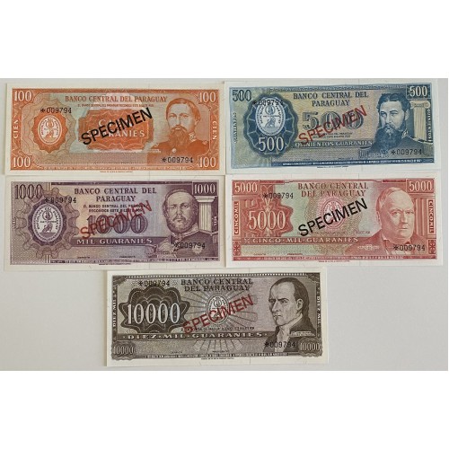 PARAGUAY 1979 . ONE HUNDRED 100 - TEN THOUSAND 10,000 GUARANIES BANKNOTES . SPECIMEN