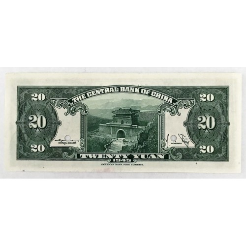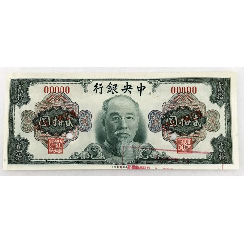 China 1940. Twenty 20 Yuan Banknote. Serial: 00000. Specimen. Very Scarce.