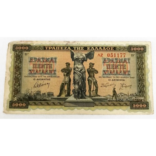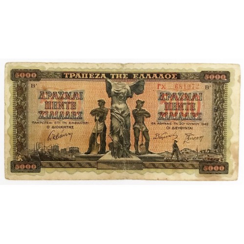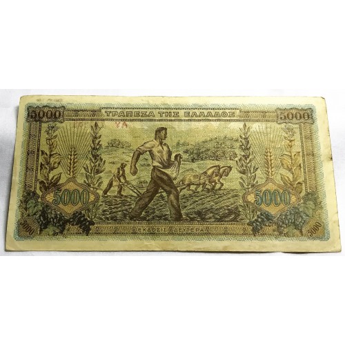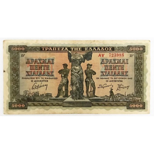 Greece 1942. Five Thousand 5,000 Drachmai Banknote. Error. Some Serials