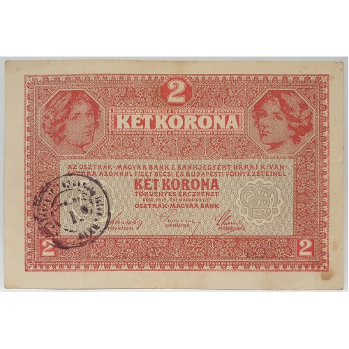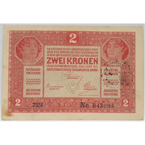 Hungary 1917.Two 2 Kronin Banknote. Serial: 043684 / 7551. Error. The Seal