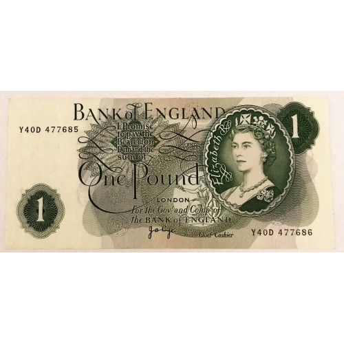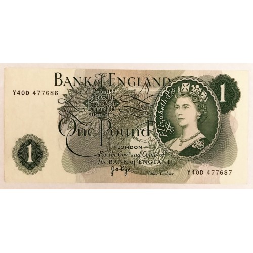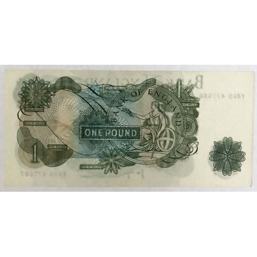 Great Britain UK 1960 One 1 Pound Banknote. Serial: Y40D477685/6,