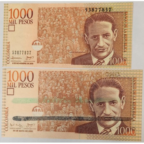 COLUMBIA 2003 . ONE THOUSAND 1,000 PESOS BANKNOTE . ERROR . NO SERIALS