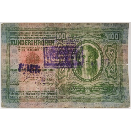 HUNGARY 1912 . ONE HUNDRED 100 KORONA BANKNOTE . ERROR . WET INK TRANSFER