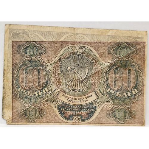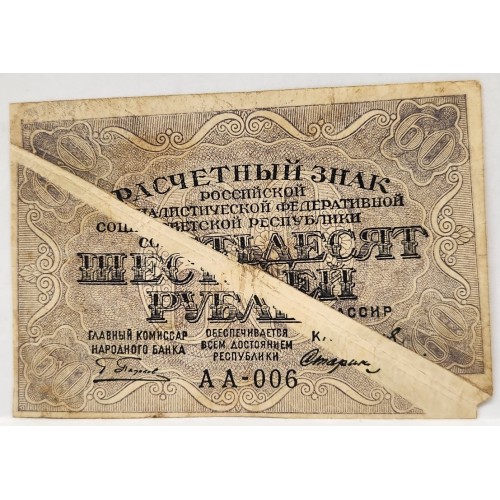 Russia 1919 Sixty 60 Roubles Banknotes. Serial: AA-006. Error. Creased during