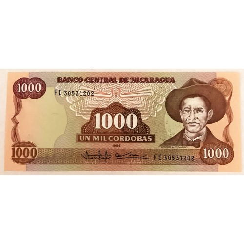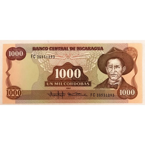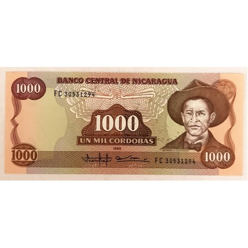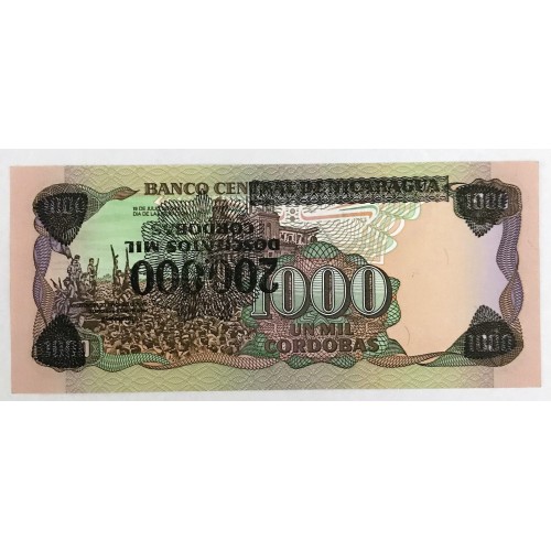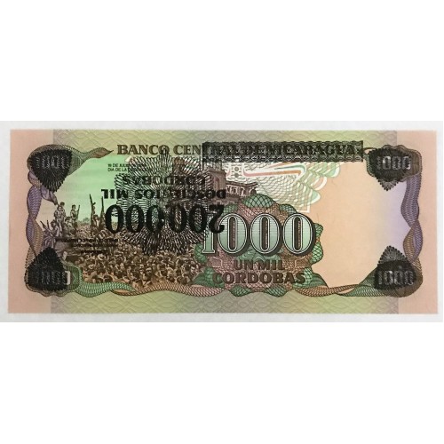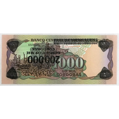 NICARAGUA 1985 . ONE THOUSAND 1,000 CORDOBAS BANKNOTE . ERROR . OVERPRINT IS UPSIDE DOWN